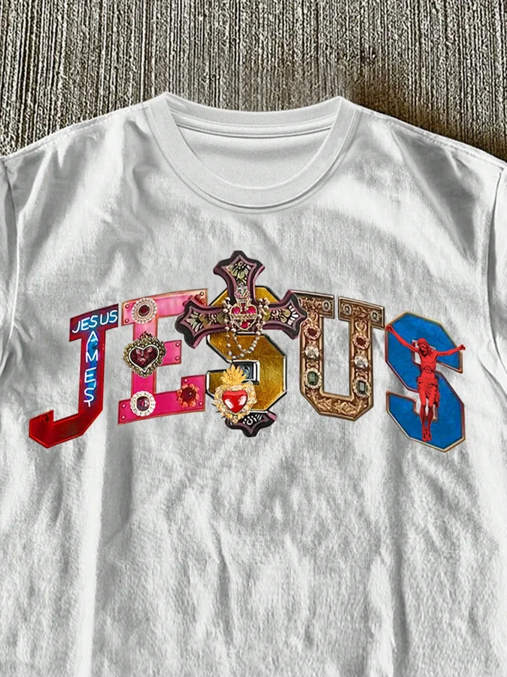 (220 Cotton T-Shirt) Men's Religious Faith Multicolor Cross & Jesus Text Graphic Printed T-Shirt