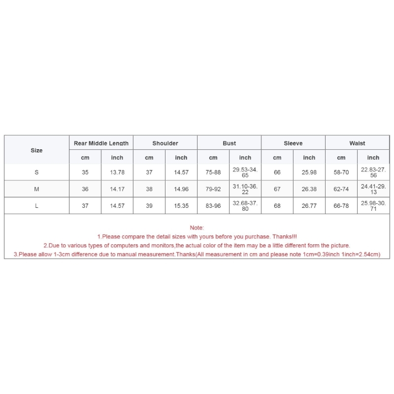 Size:L Rear Middle Length:37cm(14.57inch) Shoulder:39cm(15.35inch) Bust:83-96cm(32.68-37.80inch) Sleeve:68cm(26.77inch) Waist:66-78cm(25.98-30.71inch)