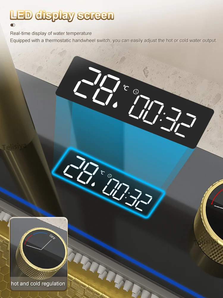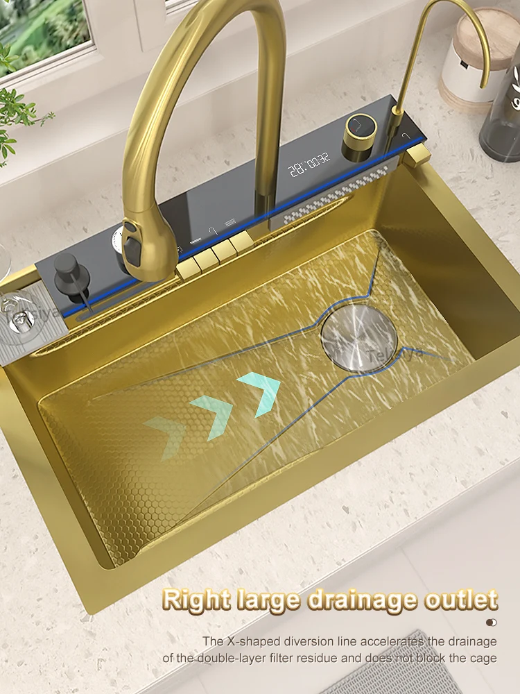 Golden Waterfall Kitchen Sink Stainless Steel Sink Embossed Digital Display Single Slot Apartment Gold Wash Basin
