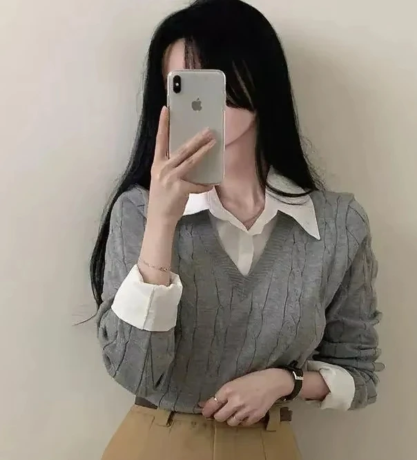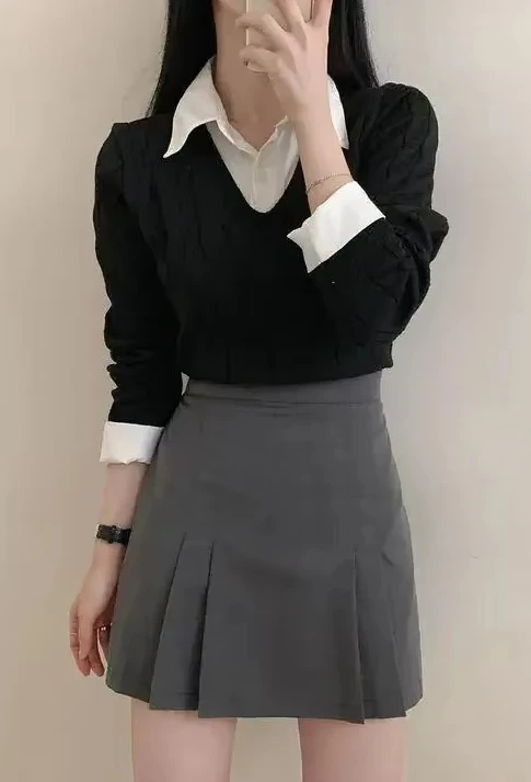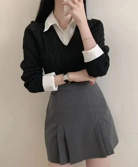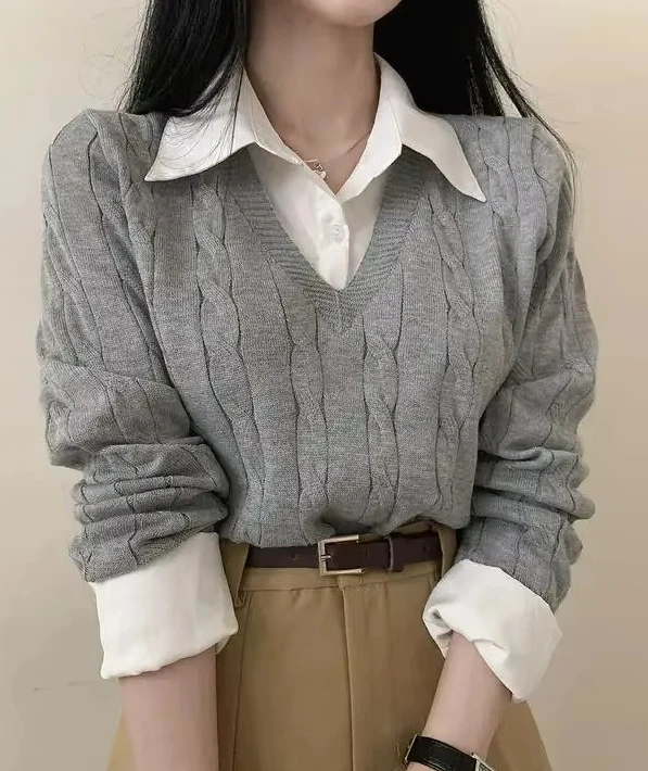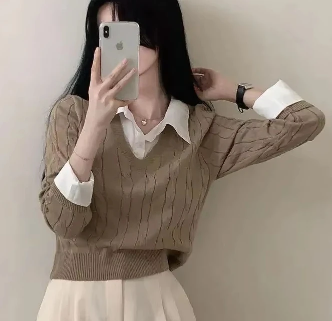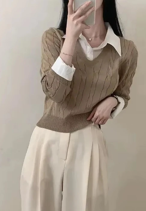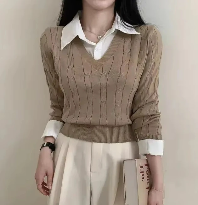 Korean Chic Spring and Autumn Age-Reducing Sweaters Retro Temperament Preppy Fake Two Pieces Shirts Twist Knit Women's Y2k Tops