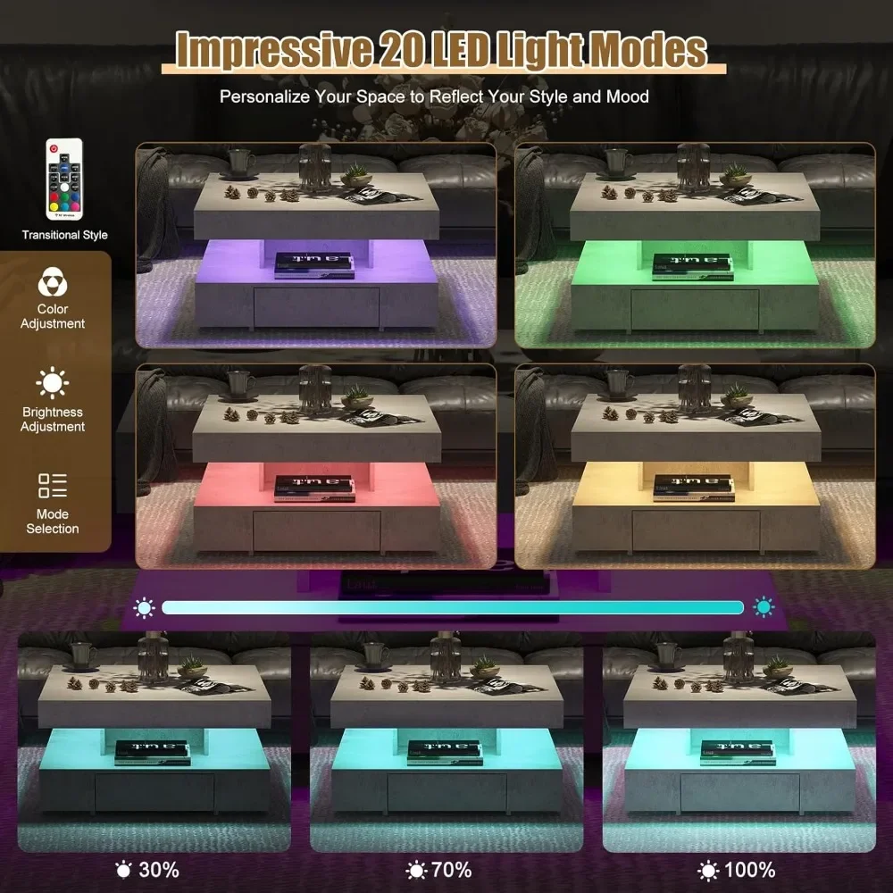 • Smart LED Coffee Table with Multiple Organization Space:This minimalist modern LED center middle table with storage features an open display shelf and 2 drawers, which provides an ample storage space to hold your daily essentials, such as books, magazines, gaming controllers, remote control, laptops, snacks, fruit trays and decor to keep your living room neatly organized, clutter-free and easily accessible.