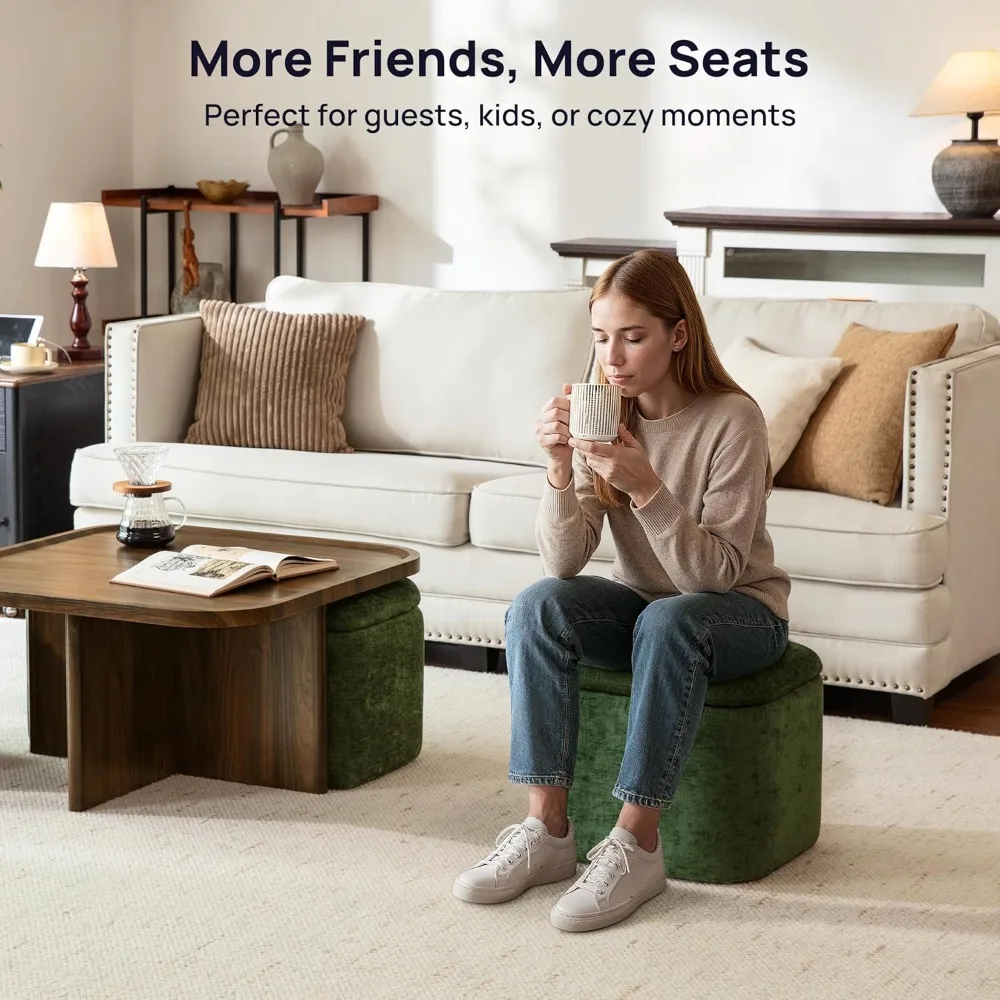 Mid-Century Modern Small Square Coffee Table with Storage + 4 Chenille Ottomans (Living Room/Small Space)
