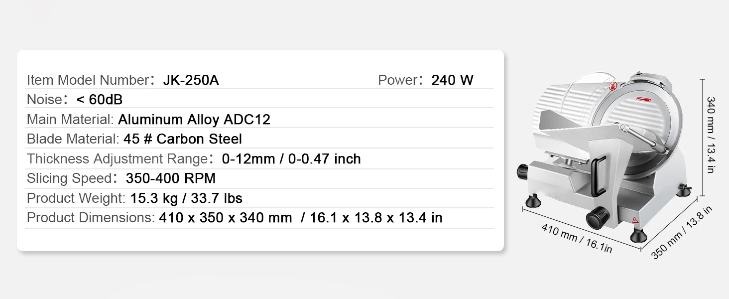 Adjustable Thickness: The slicer comes with a thickness adjustment knob, allowing you to set the thickness from 0 to 0.47 inches (0 to 12mm) based on your preparation needs. Perfect for making burgers, sandwiches, cold cuts, and fruit platters.